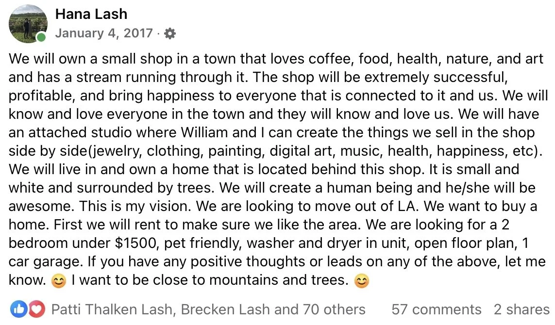 Hana and Will met in November of 2012 while working together at The Bar Marmont off of Sunset Blvd. They both knew the first day they met that they had met “the one.” For the first month of knowing eachother they would work until 2am-3am in the morning together, and then individually hurry home to their seperate residences to log on to Facebook to continue to Facebook chat until the wee hours of the morning. After getting married in 2015, Hana woke up one day and realized she wanted to buy a house. From this came further brainstorming and assessment of what both Hana and Will wanted for themselves and their lives moving forward. This is where the manifestation you see above came from that Hana posted on Facebook in January of 2017.