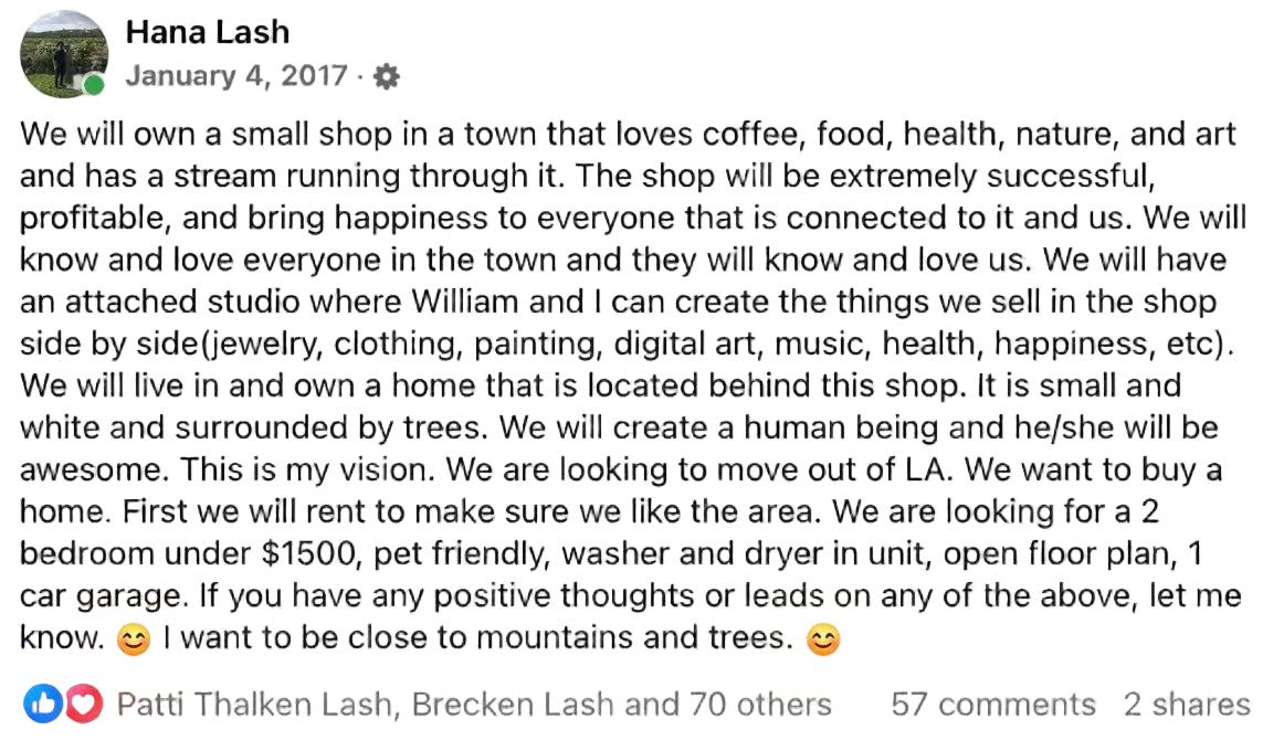 After getting married in 2015, Hana woke up one day and realized she wanted to buy a house. This sparked further brainstorming and reflection on what both Hana and Will wanted for themselves and their lives moving forward. This led to the manifestation you see above, which Hana shared on Facebook in January 2017.