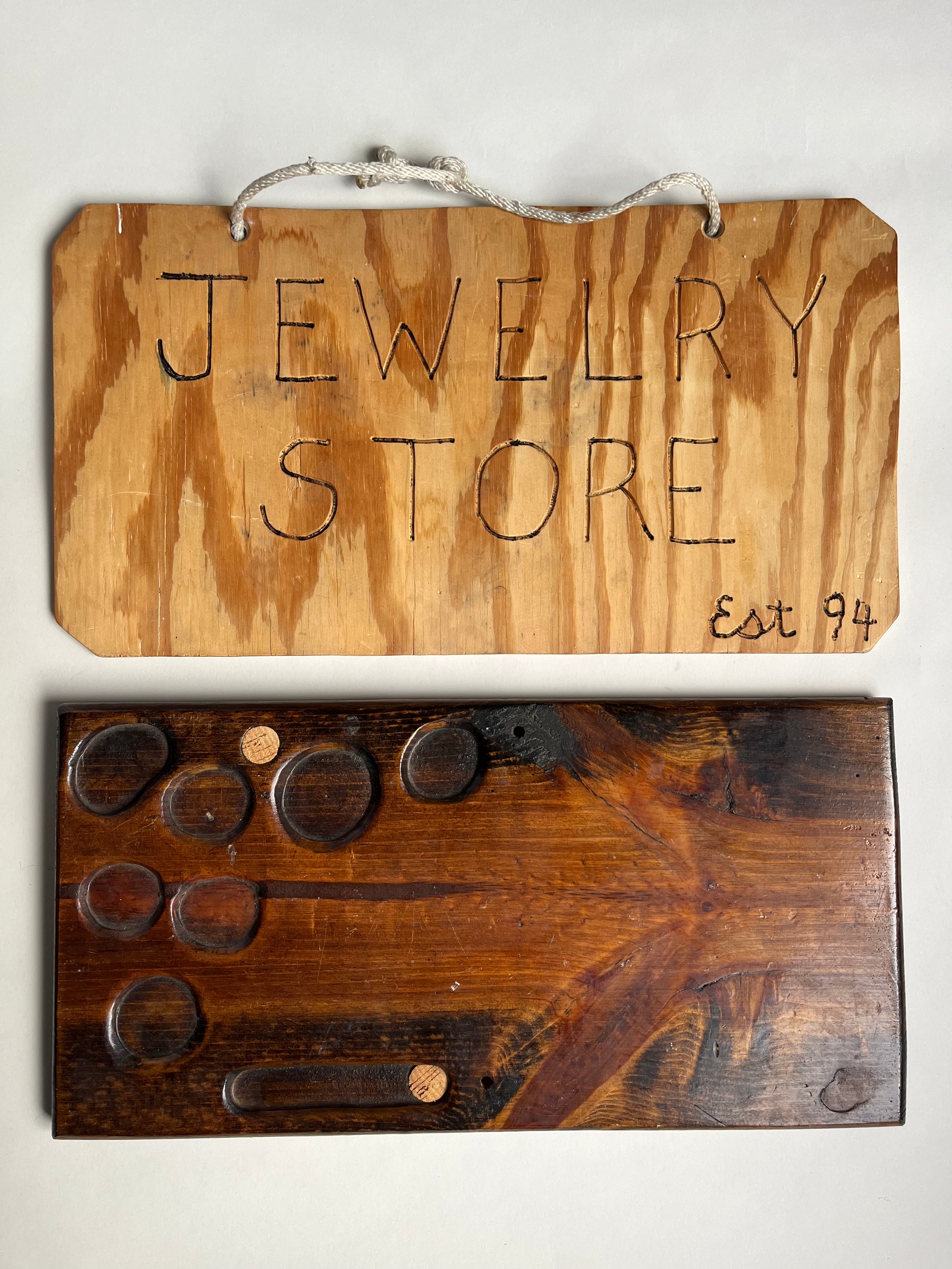 Photo of Hana's first jewelry store sign photographed with a handmade bead board both made by her Dad.