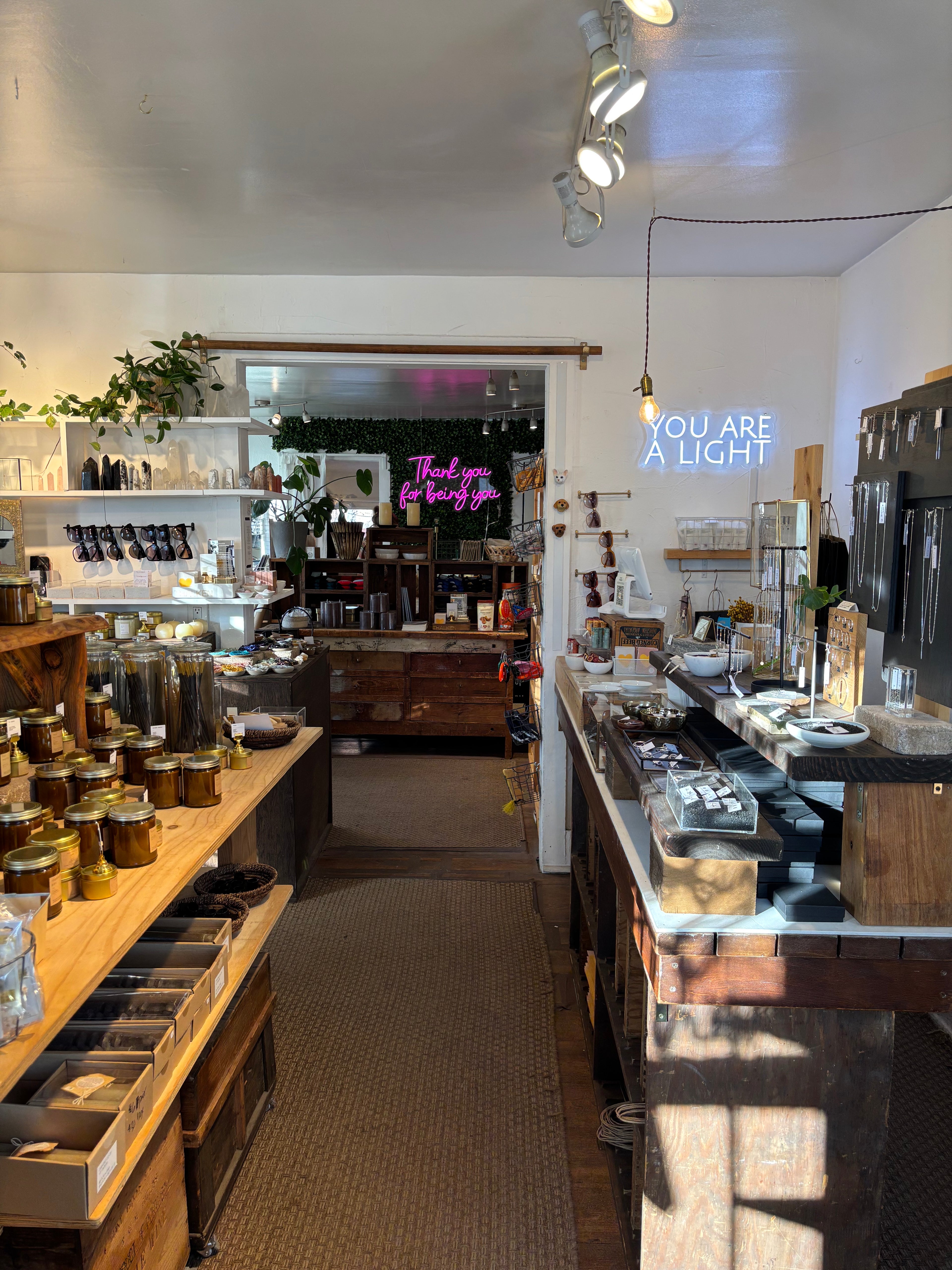 This shared value is why they painted YOU ARE BEAUTIFUL and YOU ARE ENOUGH on the outside of the shop. Their products are more than just items—they are tools for empowerment and connection. The dainty cord mantra bracelets remind people to stay strong and seek the silver lining. Jewelry highlights the beauty that already exists. Candles are crafted to support creativity, reset the nervous system, or set a romantic vibe. Curated socks are fun, high-quality, and signal self-care.