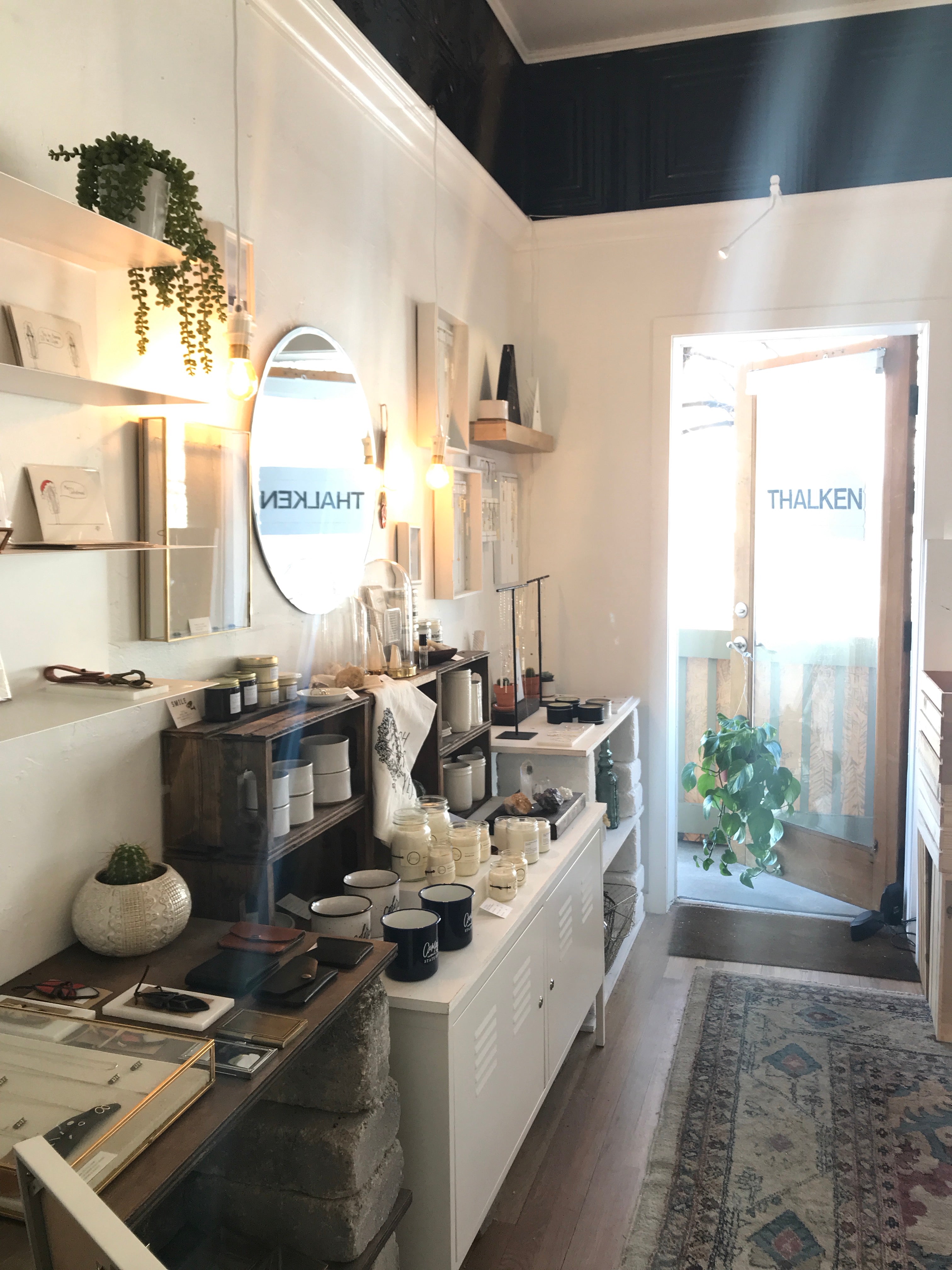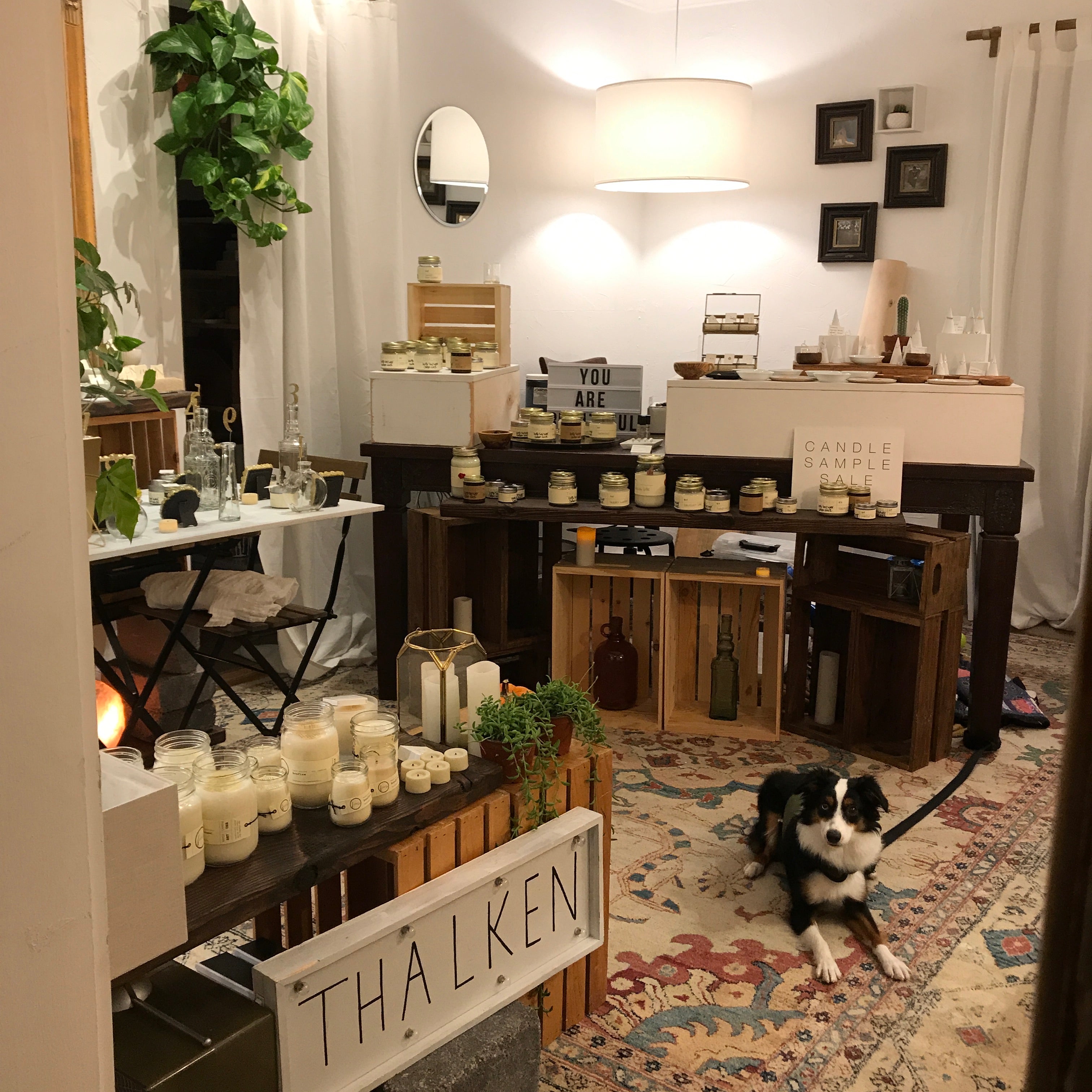 THALKEN is owned and operated by a wife(Hana), husband(William), and toy/mini Australian Shepherd(Max) team. Hana makes most of the jewelry, William pours the candles every morning like donuts, they both create a lot of the cards and art, and the rest are things Hana and Will are just obsessed with… from cozy beautiful socks, to rustic organic pottery, to magic sparkly crystals, to natural hand-poured soap. Max can be found at the shop most days. He is our “sock connoisseur” in that he loves to show you his latest sock pick of the month by holding it in his mouth and “singing” it at you. We like to tell everyone that comes in that, “you never have to buy anything.” So, if you’re ever in the area, please feel free to stop by and say hi, even if it’s for a second. Never stop growing. Always remember to breathe. Go all in every time.