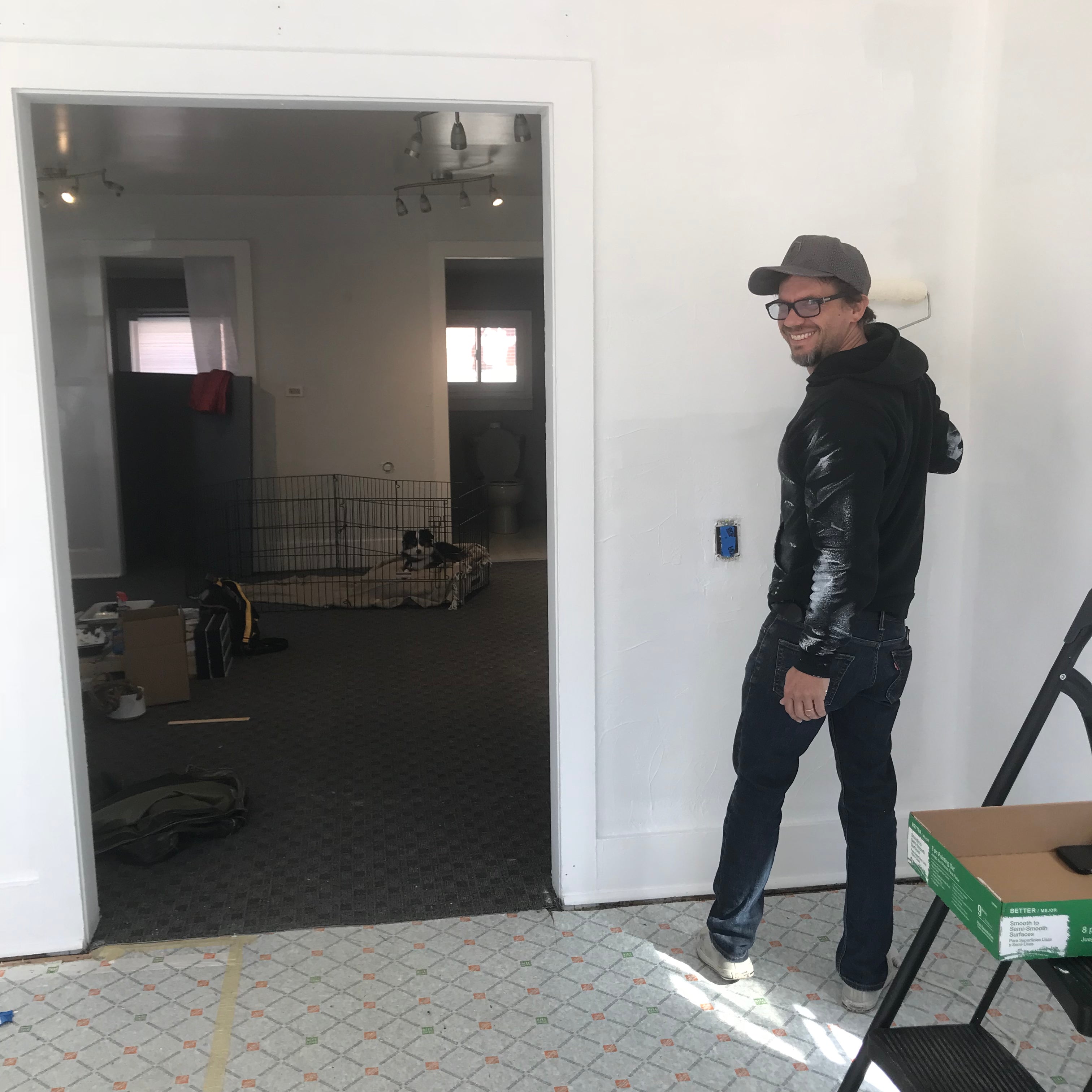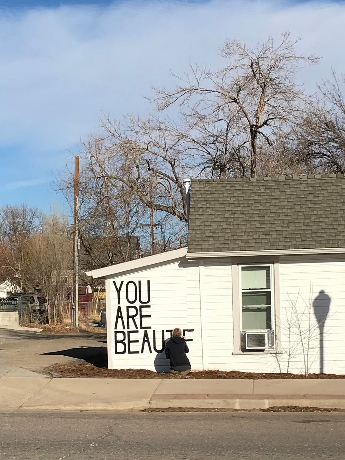 One of the first things they did was paint YOU ARE BEAUTIFUL and YOU ARE ENOUGH on the outside of the building. They are big fans of white paint, warm woods, and minimalist design, and slowly did everything they could with the small amount of money they had. They literally installed the faux wood floors themselves—which are now falling apart and held together with brown gaffer tape.